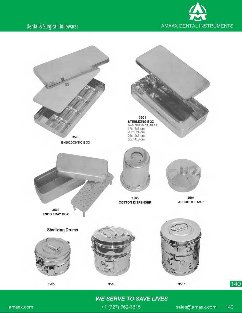 3501 STERLIZING BOX Available in dif. sizes 17x17x3 cm 20x10x4 cm 25x12x6 cm 3500 30x14x6 cm ENDODONTIC BOX 3503 3504 COTTON DISPENSER ALCOHOL LAMP 3502 ENDO TRAY BOX Sterlizing Drums 3505 3506 3507
