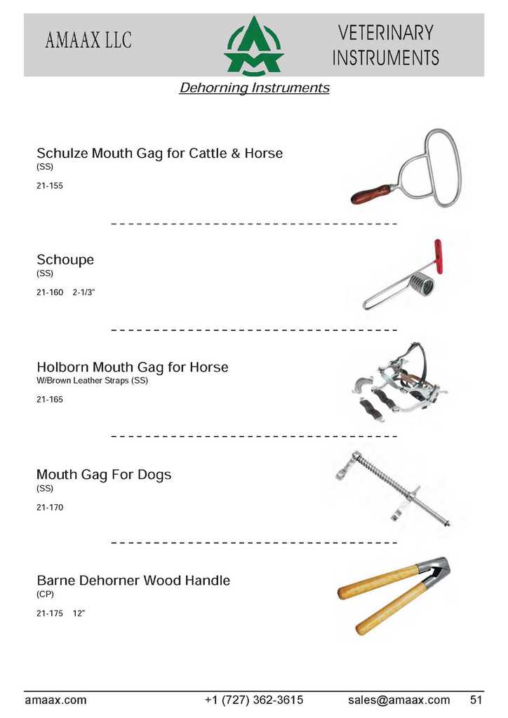 Dehorning Instruments Schulze Mouth Gag for Cattle & Horse (SS) 21-155 Schoupe (SS) 21-160 2-1/3″ Holborn Mouth Gag for Horse W/Brown Leather Straps (SS) 21-165 Mouth Gag For Dogs (SS) 21-170 Barne Dehorner Wood Handle (CP) 21-175 12?