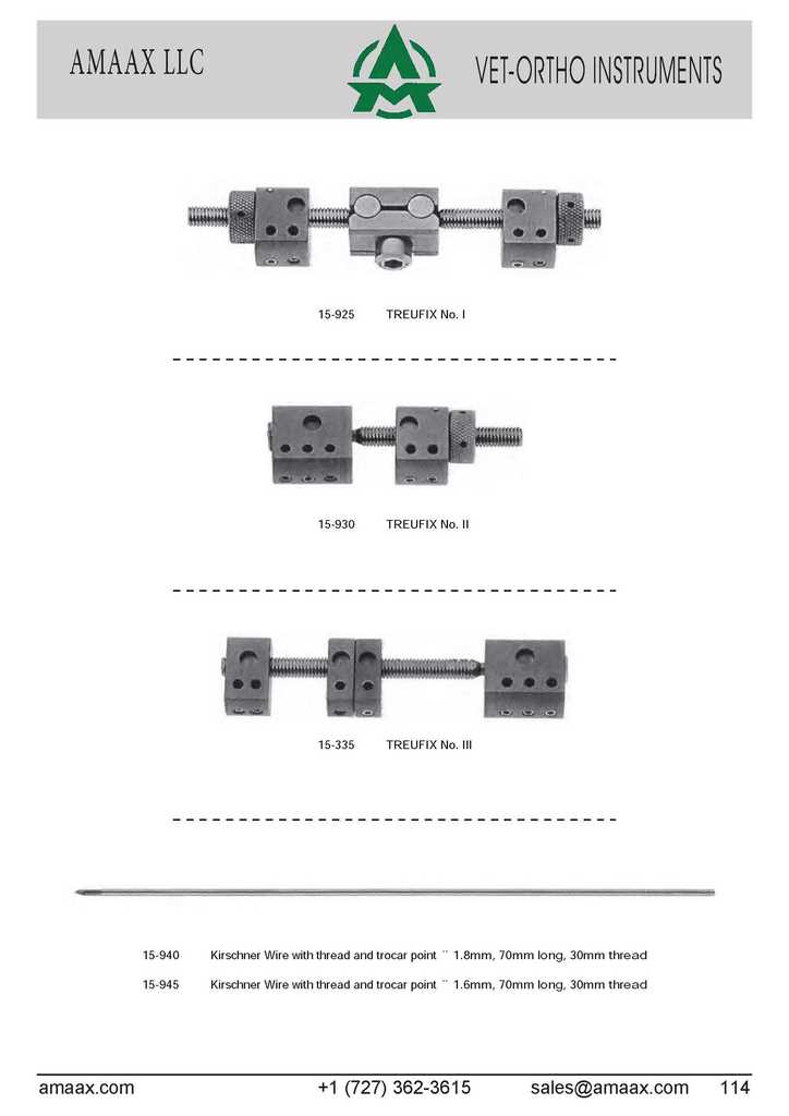 15-925 TREUFIX No. I 15-930 TREUFIX No. II 15-335 TREUFIX No. III 15-940 Kirschner Wire with thread and trocar point ? 1.8mm, 70mm long, 30mm thread 15-945 Kirschner Wire with thread and trocar point ? 1.6mm, 70mm long, 30mm thread
